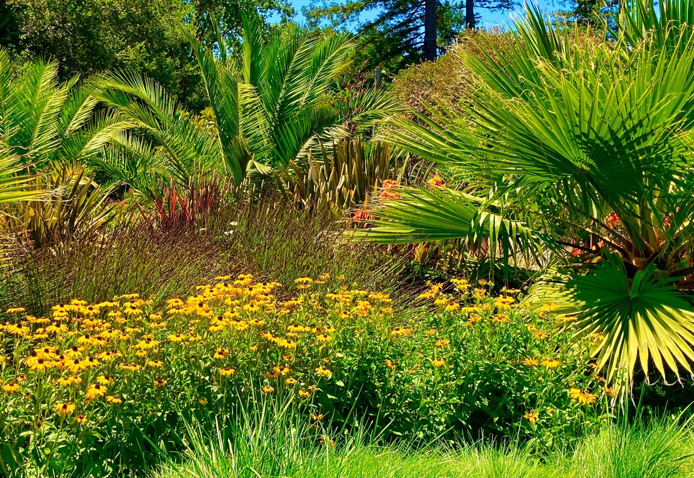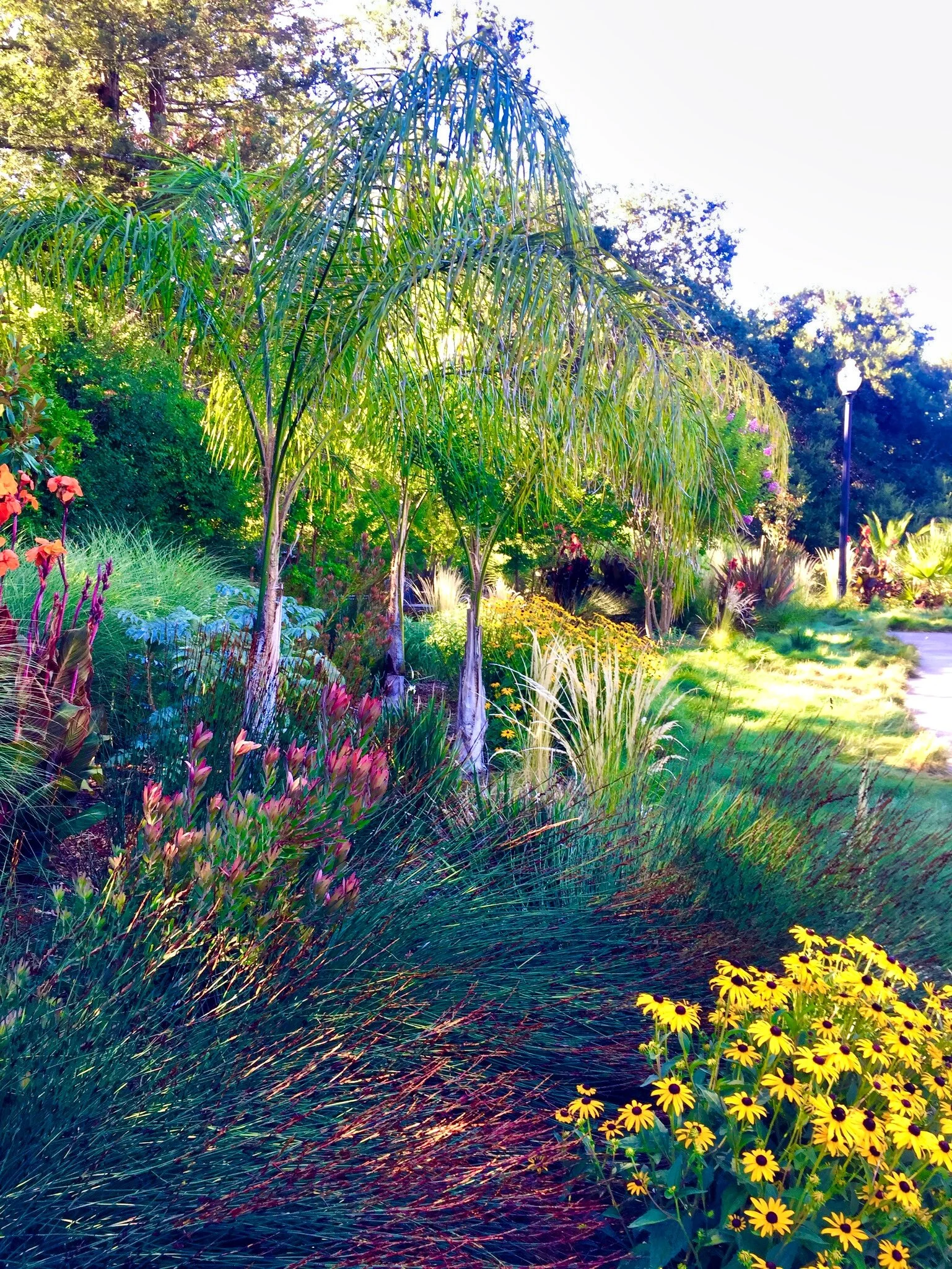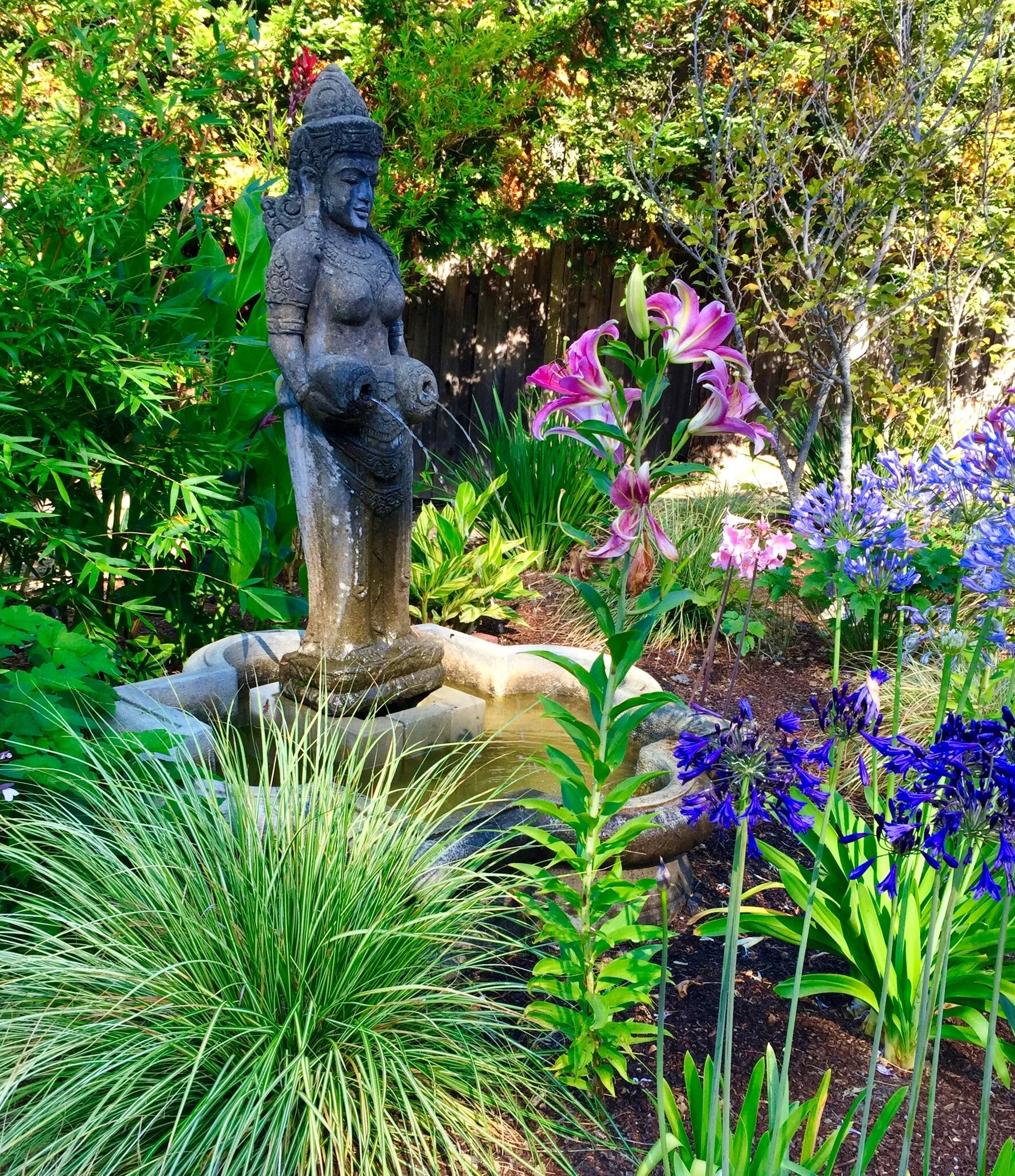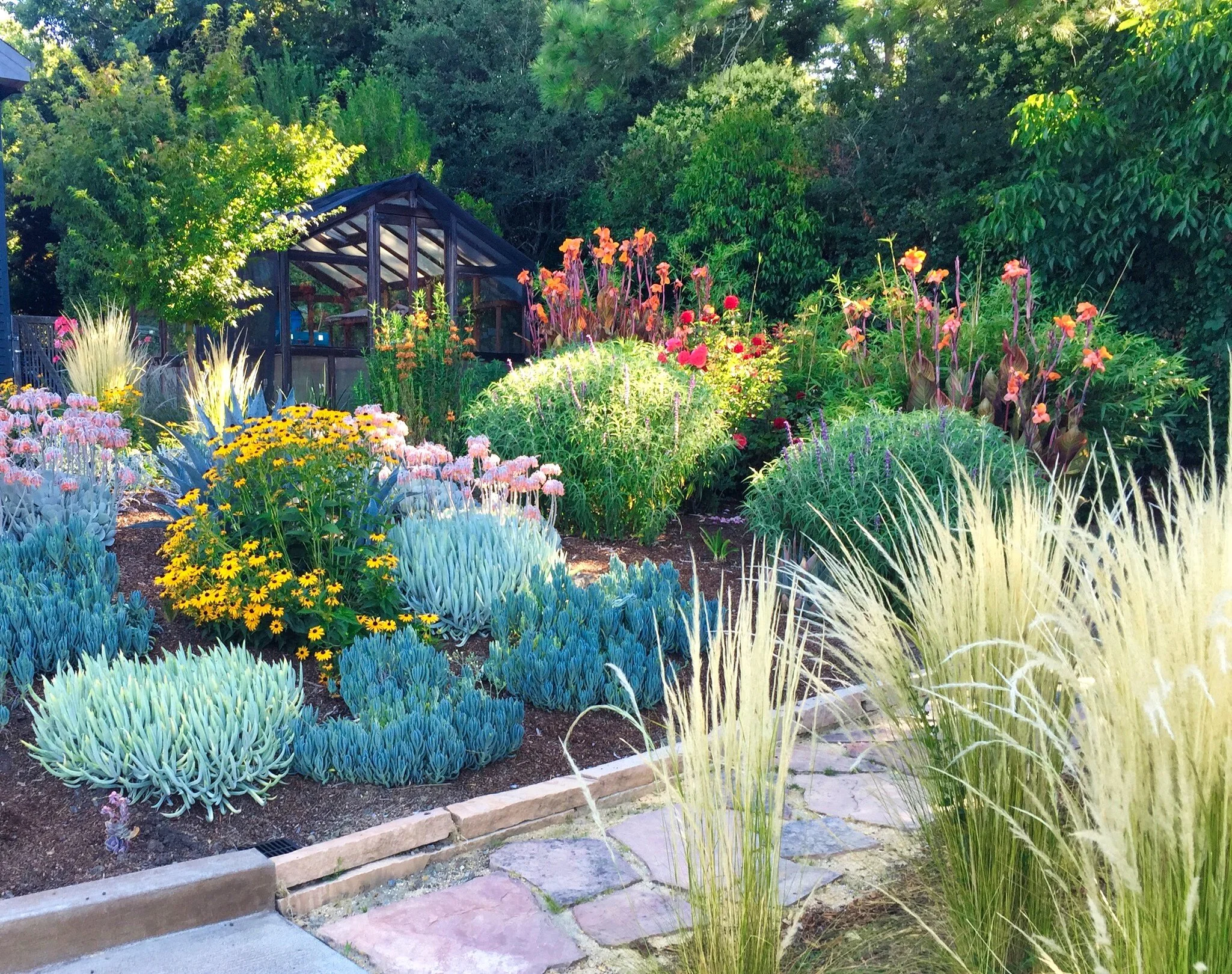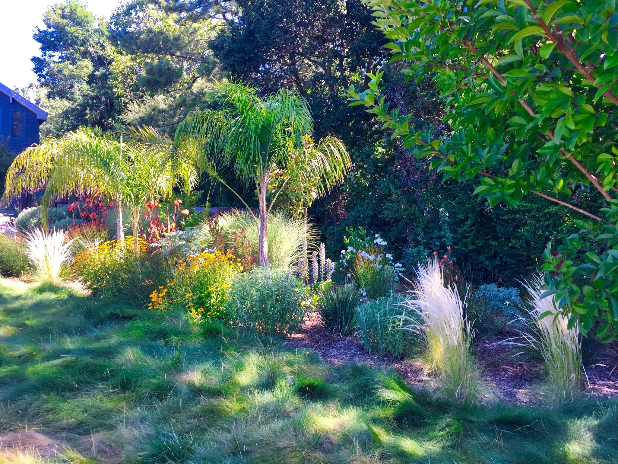 Using a variety of exotic and native plantings we created multiple garden rooms that offer sanctuaries to reflect on nature and all it has to offer. An orchard with a pollinator garden provides abundant fruit. A fountain reflects light and adds a calming sound. Dramatic foliage from succulents and palms cast shadows that move with the sun and wind. Roses and perennials are integrated into the design as color highlights. Instead of traveling on weekends to get away, they find themselves enjoying their own backyard oasis.